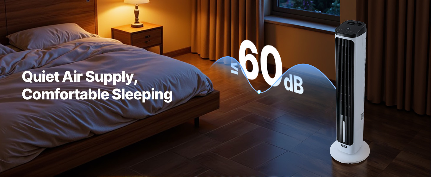 - Quiet Operation: Our tower fan features a high-quality DC motor, ensuring quiet performance at all speeds. Even in sleep mode, the noise level stays as low as ≤60dB, allowing you to enjoy coolness while maintaining a peaceful sleep environment